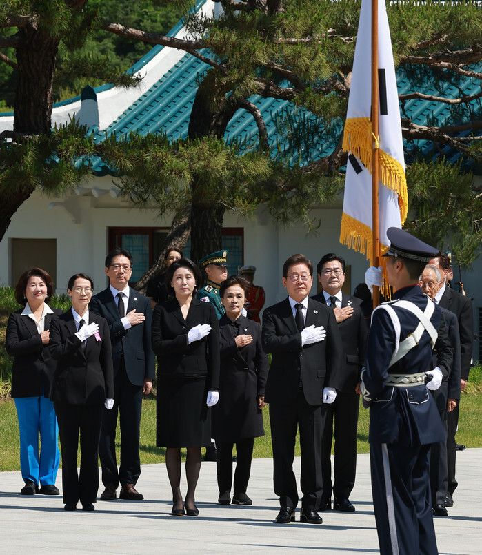 Newly elected President Lee Jae-myung (3rd from R) and his wife, Kim Hye-kyung (2nd from L), salute the national flag as they visit the National Cemetery in Seoul on June 4, 2025, to pay tribute to South Korean patriotic martyrs on his way to his inauguration ceremony at the National Assembly in the capital. (Pool photo) (Yonhap)