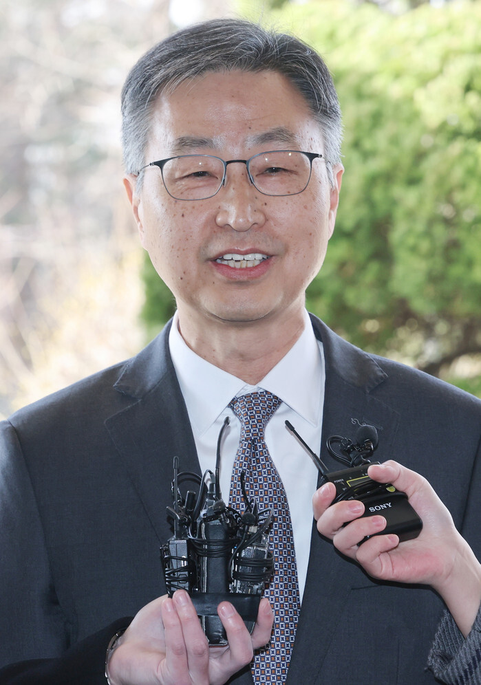 Choe Jae-hae, chair of the Board of Audit and Inspection, speaks to reporters at the board's headquarters in Seoul on March 13, 2025, after the Constitutional Court rejected a motion impeaching Choe over his alleged poor review of suspected irregularities surrounding the 2022 relocation of the presidential office and residence, returning him to his duties. (Yonhap)