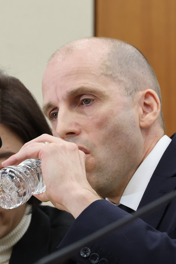Harold Rogers, CEO of e-commerce giant Coupang Corp., drinks water during a plenary session of the science, ICT, broadcasting and communications committee at the National Assembly in Seoul on Dec. 17, 2025, to probe into the company's massive personal data breach. (Yonhap)