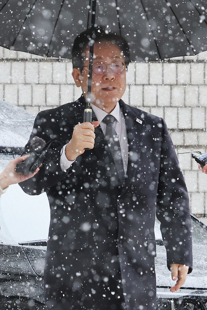 Lee Jae-myung, leader of the main opposition Democratic Party, appears in the snow at the Central District Court in Seoul on March 4, 2025, to attend a hearing regarding corruption accusations related to realty projects while serving as the mayor of Seongnam in the mid-2010s. The allegations also involve bribe-taking from Seongnam FC, a football club. (Yonhap)