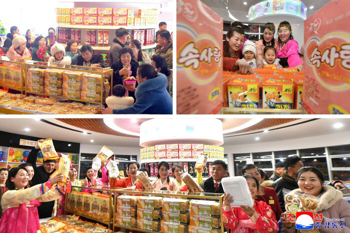 North Korean residents are jubilant during the inauguration ceremony of regional factories in Kilju, North Hamgyong Province, northeastern North Korea, on Dec. 23, 2025, in this combined photo released by the North's official Korean Central News Agency the next day. The dedication of the factories is part of a project that the North's leader Kim set forth in January 2024 to build modernized factories in 20 cities and counties over the next decade to enhance the living standards of the people. (For Use Only in the Republic of Korea. No Redistribution) (Yonhap)