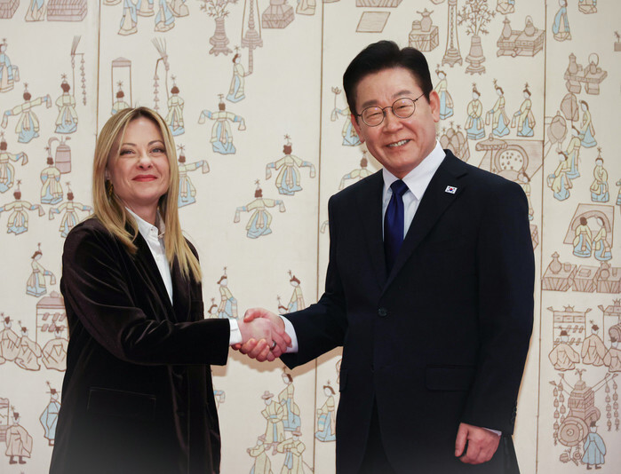 South Korean President Lee Jae Myung (R) and Italian Prime Minister Giorgia Meloni shake hands prior to their talks at the presidential office Cheong Wa Dae in Seoul on Jan. 19, 2026. (Yonhap)