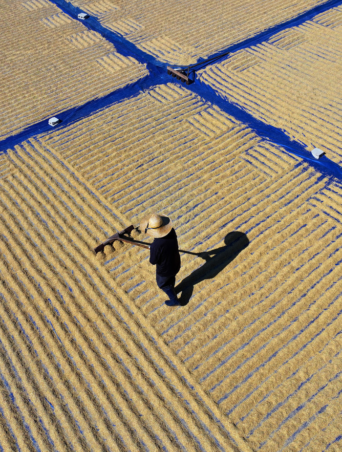 A farmer rakes harvested rice placed to dry in the sun in the city of Chuncheon, northeast of Seoul, on Sept. 11, 2025. Drying reduces grain moisture content to a safe level for storage. (Yonhap)