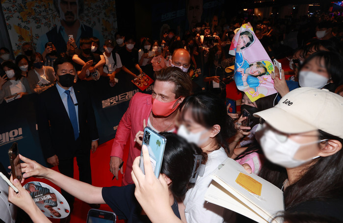 Hollywood actor Brad Pitt takes photo with a fan during a publicity event for the new movie "Bullet Train" in Seoul on Aug. 19, 2022. The movie will be released in South Korea on Aug. 24. (Yonhap)
