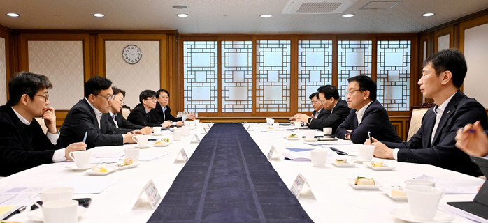 Acting President Choi Sang-mok (2nd from R), who serves concurrently as deputy prime minister for economic affairs and finance minister, talks with Financial Supervisory Service chief Lee Bok-hyun (far R), Bank of Korea Deputy Gov. Ryoo Sang-dai (far L) and Financial Services Commission head Kim Byoung-hwan (2nd from L) during a meeting on macroeconomic and financial affairs at the government complex in Seoul on Feb. 28, 2025, in this photo released by the finance ministry. (PHOTO NOT FOR SALE) (Yonhap)