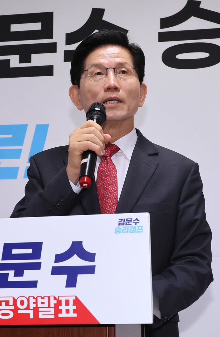 Former Employment and Labor Minister Kim Moon-soo, a contender in the conservative People Power Party's primary for the June 3 presidential election, attends a press conference to announce his election pledges at his campaign office in Seoul on April 18, 2025. (Yonhap)