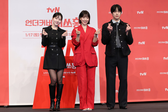 The stars of the new drama "Undercover Miss Hong" -- Ha Yoon-kyung, Park Shin-hye and Cho Han-kyul (L to R) -- pose for a photo during a publicity event in Seoul on Jan. 12, 2026. The first episode of the drama will be aired by the local cable TV network tvN on Jan. 17. (Yonhap)