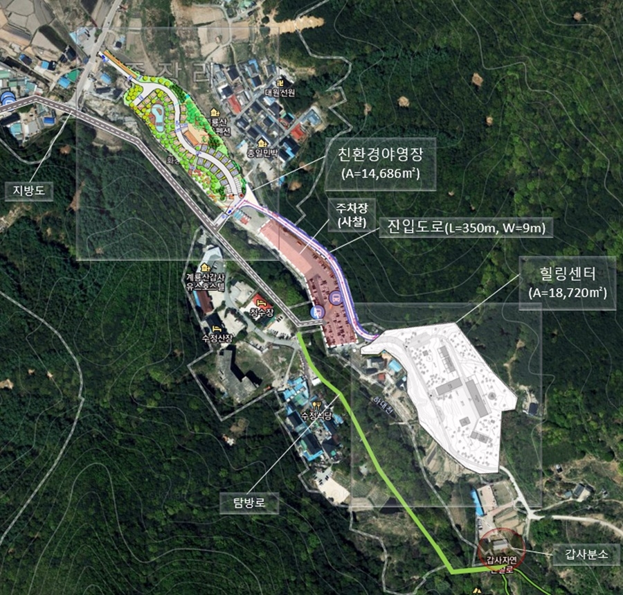 시는 국립공원 계룡산사무소와 함께 계룡면 중장리 계룡산 갑사 주차장 옆에 내년부터 2023년 말까지 154억원을 들여 친환경 야영장(1만4천686㎡)과 힐링센터(1만8천720㎡) 등을 갖춘 갑사지구 체류 인프라 조성사업을 추진한다.
