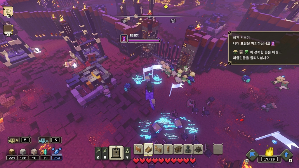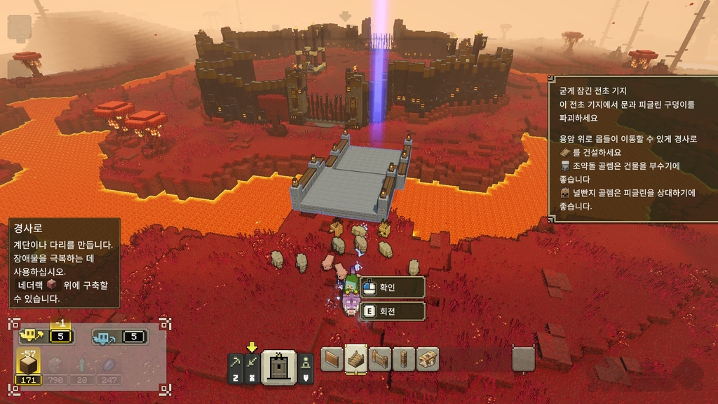 캠페인 모드에서 플레이어는 넓은 맵 각지를 돌아다니며 자원을 모으고, 지옥(네더)의 돼지 인간 '피글린'의 공격을 막아내거나 피글린의 전초기지를 공격해야 한다.