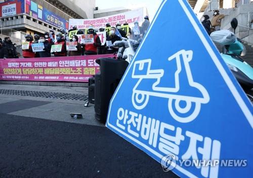 | ▲ Delivery service workers hold a press conference on their launch of a labor union in Seoul on Jan. 18, 2022. (Yonhap) |