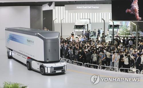 | ▲ Visitors look at Hyundai Motor Co.'s hydrogen-fueled trailer drone during the H2 Mobility+Energy Show at the KINTEX convention center in Goyang, northwest of Seoul, in the Sept. 8, 2021, file photo. The four-day show brought together 150 companies and research institutes from 12 countries. (Pool photo) (Yonhap) |