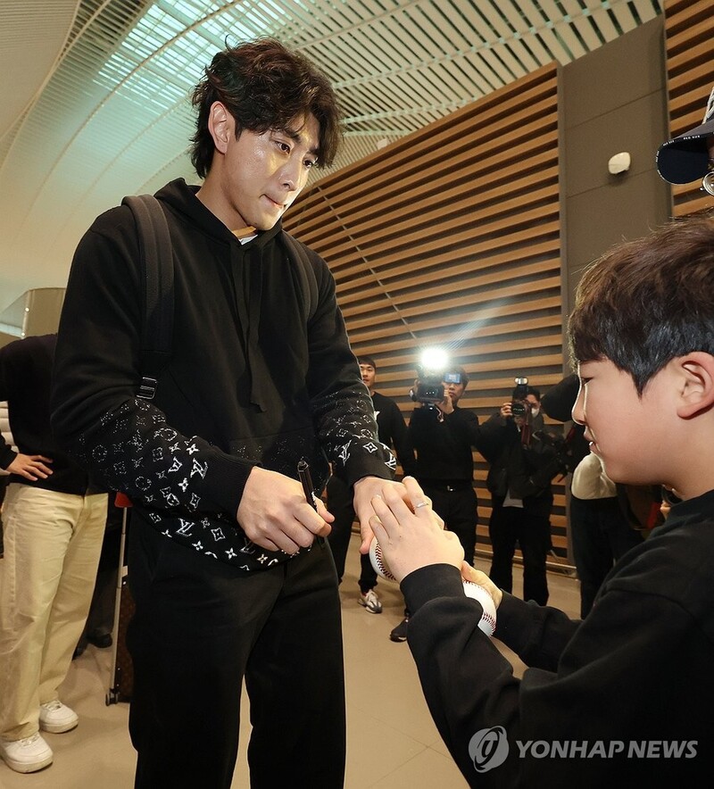 | ▲ 사인볼 건네는 이정후 (영종도=연합뉴스) 서명곤 기자 = '바람의 손자' 이정후(샌프란시스코 자이언츠)가 미국프로야구 메이저리그(MLB) 첫해 도전을 위해 1일 오후 인천국제공항 2터미널을 통해 출국하기 앞서 팬들에게 사인을 해주고 있다. 2024.2.1 seephoto@yna.co.kr |