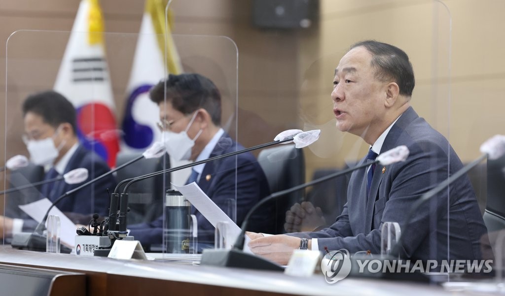 | ▲ Finance Minister Hong Nam-ki (R) speaks at an anti-inflation government meeting in Sejong on April 5, 2022. (Yonhap) |