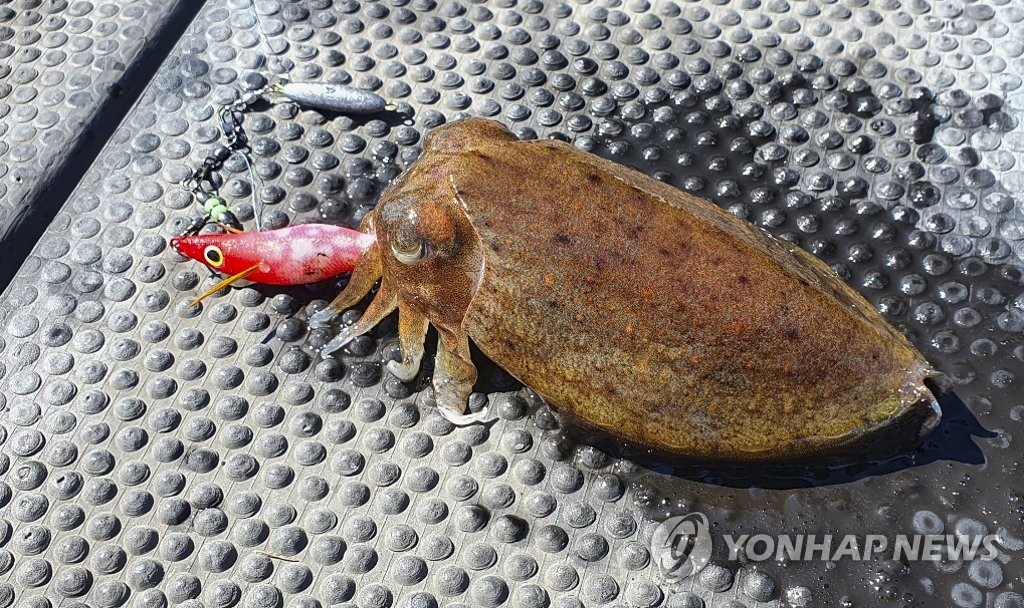 ▲ 낚시도 오징어 게임이 대세?…대박 난 갑오징어 낚시 (서울=연합뉴스) 성연재 기자 = 넷플릭스 오리지널 시리즈 '오징어 게임'이 전 세계에서 돌풍을 일으킨 가운데, 올해 국내 연안에서는 고급 어종인 갑오징어가 낚시를 통해 유례없이 많이 잡히고 있다. 갑오징어가 새우 모양의 인조 미끼에 잡힌 모습. 연합칼럼 기사 참조. 2021.10.16 [독자 제공. 재판매 및 DB 금지] polpori@yna.co.kr