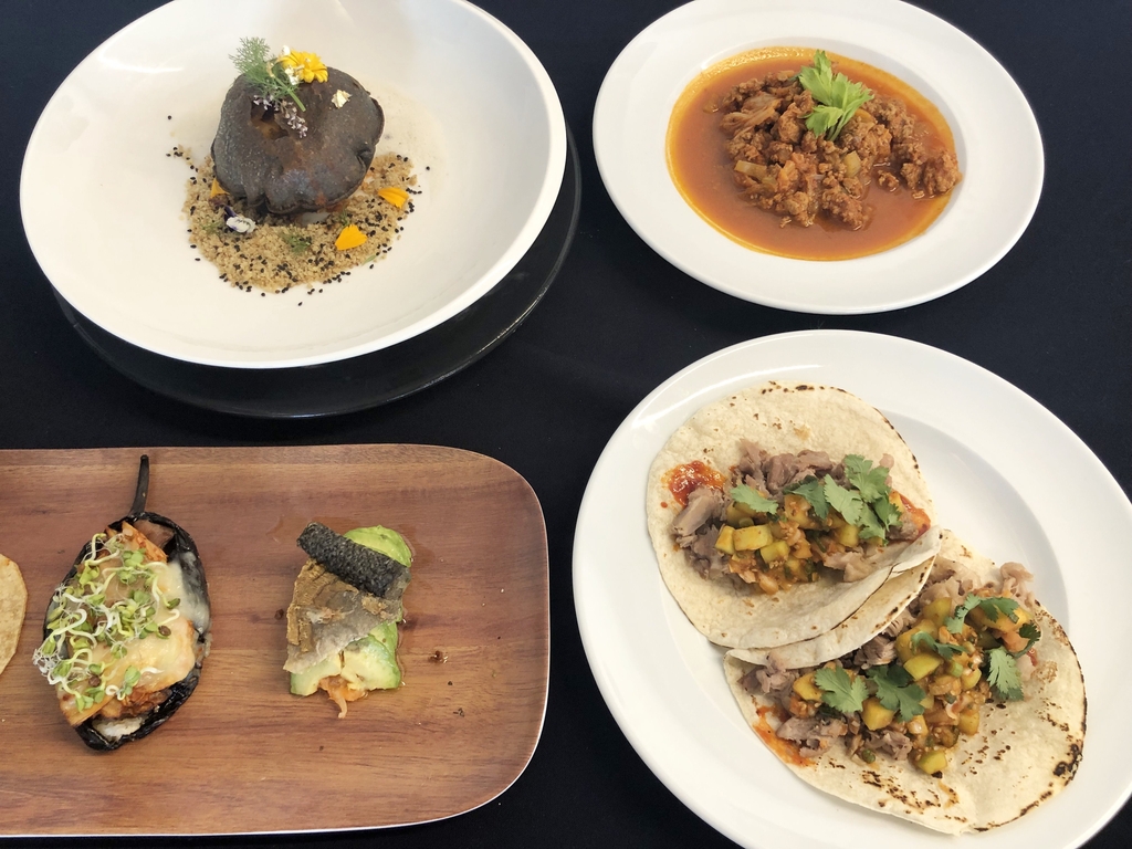 | ▲ 김치와 멕시코 음식의 만남 (멕시코시티=연합뉴스) 고미혜 특파원 = 주멕시코 한국문화원이 28일(현지시간) 멕시코시티에서 연 김치 대축제에서 요리대회 참가자들이 김치를 활용해 선보인 다양한 퓨전 음식. 2021.11.29. mihye@yna.co.kr |
