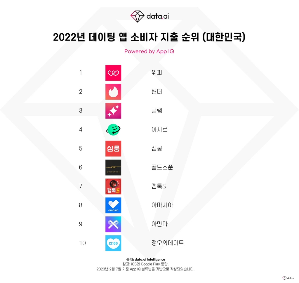 | ▲ 2022년 데이팅 앱 소비자 지출 순위(대한민국) [data.ai 제공. 재판매 및 DB 금지] |