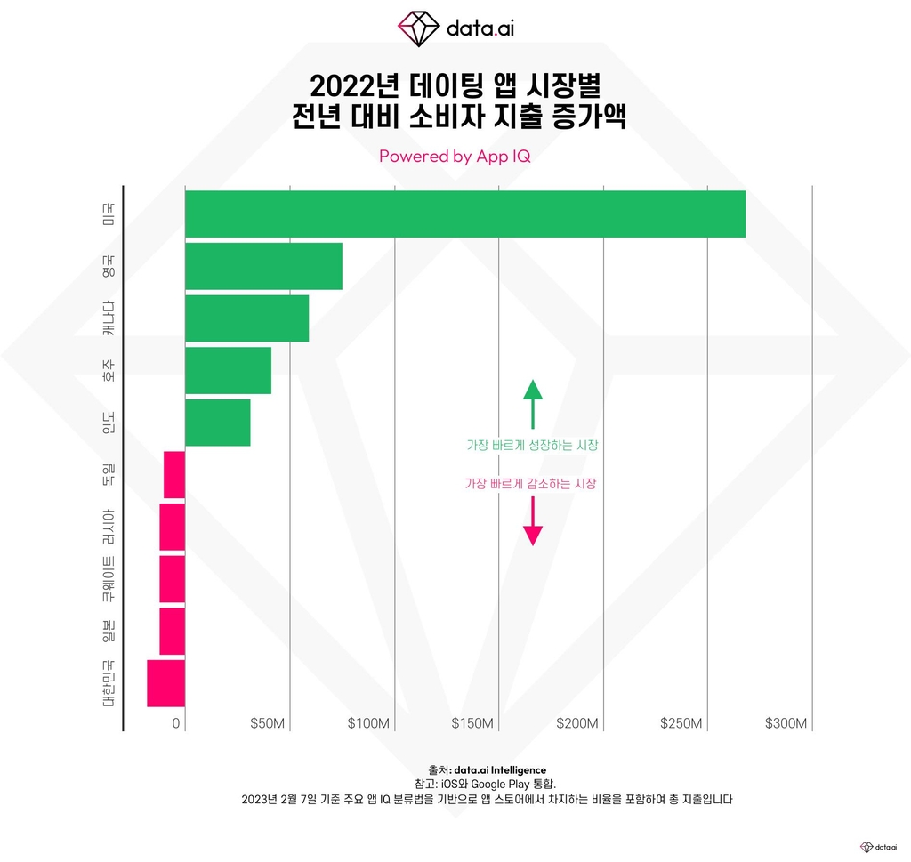 | ▲ 2022년 데이팅 앱 시장별 전년 대비 소비자 지출 증가액 [data.ai 제공. 재판매 및 DB 금지] |