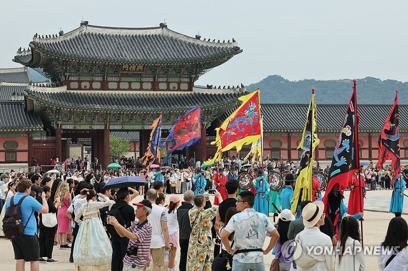 | ▲ 수문장 교대식 관람하는 관광객 (서울=연합뉴스) 임화영 기자 = 유커의 유입과 함께 한국을 찾는 관광객들이 증가하고 있는 가운데 27일 서울 종로구 경복궁을 찾은 외국인 관광객들이 수문장 교대식을 관람하고 있다. 2023.8.27 hwayoung7@yna.co.kr |