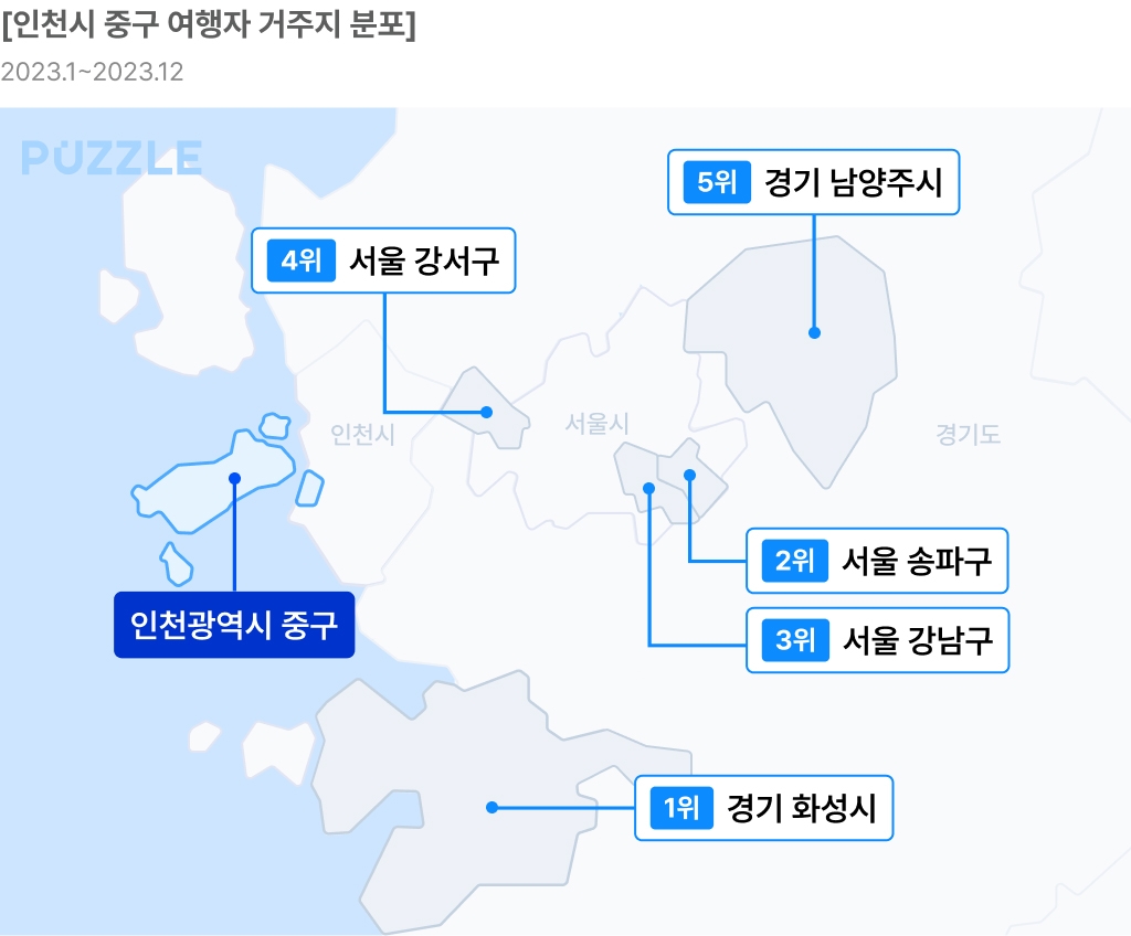 | ▲ 인천시 중구 여행자 거주지 분포 [SK텔레콤 데이터 서비스 '지오비전 퍼즐' 제공. 재판매 및 DB 금지] |