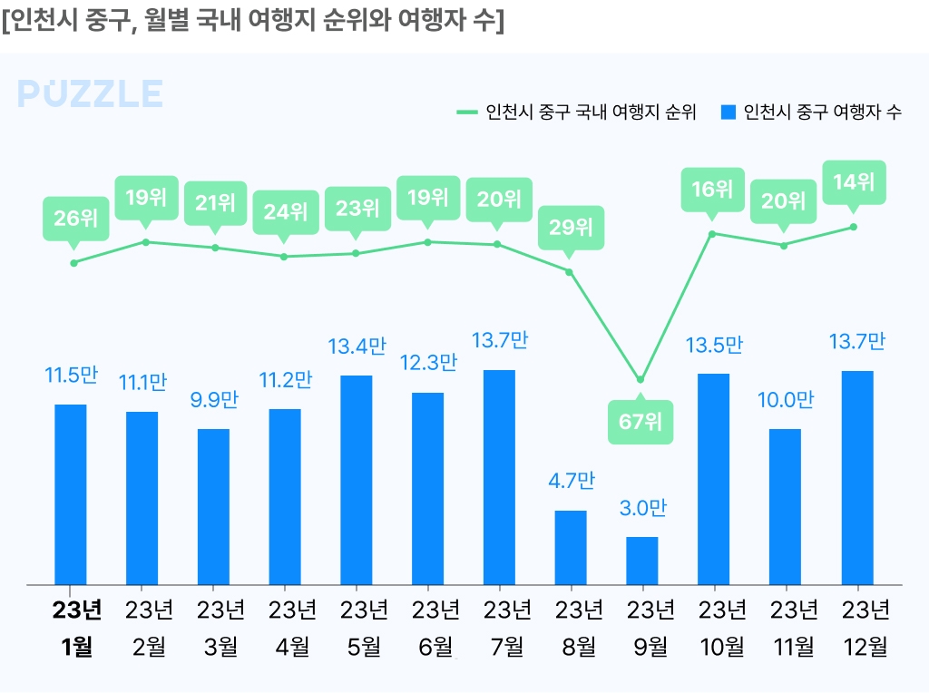 | ▲ 인천시 중구, 월별 국내 여행지 순위와 여행자 수 [SK텔레콤 데이터 서비스 '지오비전 퍼즐' 제공. 재판매 및 DB 금지] |