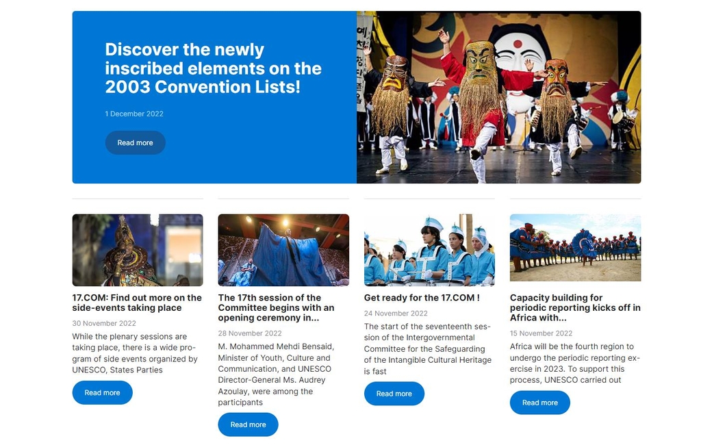 | ▲ 유네스코 인류무형문화유산 누리집의 새로운 소식 부분 제17차 무형유산보호협약 정부 간 위원회(무형유산위원회)에서 새로 등재된 무형유산을 소개하면서 경북의 무형문화재인 '예천청단놀음' 사진을 대표 사진으로 보여주고 있다. [누리집 캡처. 재판매 및 DB 금지] |