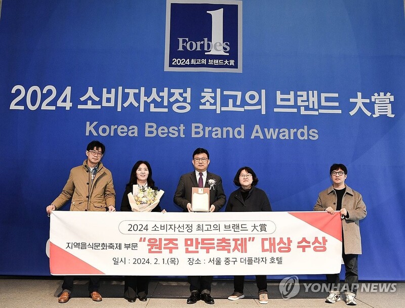 | ▲ 원주 만두축제 2024 최고의 브랜드 대상 수상 (원주=연합뉴스) 2023 원주 만두축제가 2024 소비자 선정 최고의 브랜드 대상에서 지역음식문화축제 부문 대상을 받은 가운데 1일 서울에서 열린 시상식 직후 김태훈 원주 부시장 등이 기념사진을 촬영하고 있다. 2024.2.1 [원주시 제공.재판매 및 DB 금지] jlee@yna.co.kr |