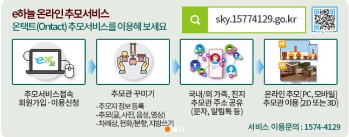 이 서비스는 코로나19 감염병 확산 후 2020년 9월 추석 때 처음 도입됐다. 'e하늘 장사정보시스템'(sky.15774129.go.kr)에서 회원가입하면 해외동포를 포함해 누구나 무료로 추모관을 열 수 있다.