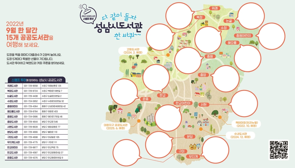 9일 경기도와 시군에 따르면 성남시립도서관은 관내 15곳의 공공도서관이 참여하는 '다 같이 돌자 성남시 도서관 한 바퀴' 스탬프 투어 행사를 진행한다.