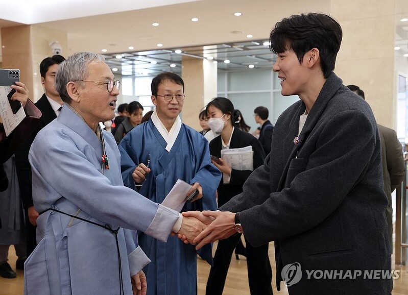 | ▲ 박태환 선수와 인사 나누는 유인촌 장관 (서울=연합뉴스) 유인촌 문화체육관광부 장관이 2일 서울 중구 국립극장 해오름극장에서 열린 '2024 설맞이 음악회 & 신년 인사회'에서 박태환 선수와 인사를 나누고 있다. 2024.2.2 [문화체육관광부 제공. 재판매 및 DB 금지] photo@yna.co.kr |