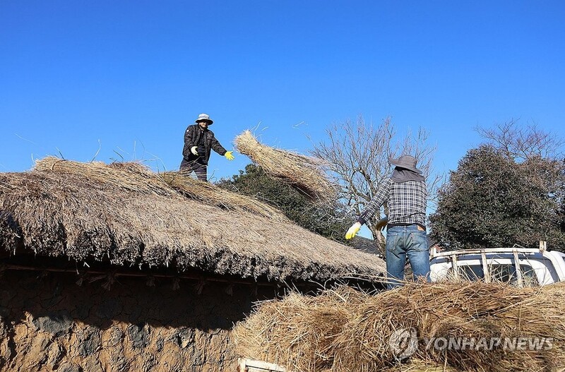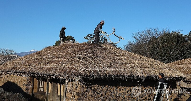 | ▲ 제주 성읍민속마을 초가지붕 잇기 '한창' (서귀포=연합뉴스) 지난 1월 16일 오전 제주 서귀포시 표선면 성읍민속마을에서 주민들이 초가 위에서 새(띠)를 덮는 지붕 잇기 작업을 하고 있다. 2024.1.16 [연합뉴스 자료사진] |