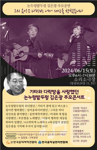 (서울=연합뉴스) 이태수 기자 = 1970∼80년대 사랑받은 부부 포크 듀오 '논두렁밭두렁'의 고(故) 김은광(1953∼2010)을 기리는 추모 콘서트가 15일 오후 6시 서울 송파구 오금동 소리 소극장에서 열린다.