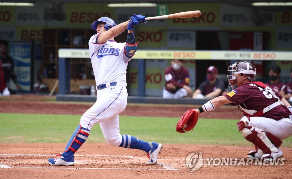 | ▲  In this file photo from Sept. 1, 2021, Kang Min-ho of the Samsung Lions (L) takes a swing against the Kiwoom Heroes in the bottom of the first inning of a Korea Baseball Organization regular season game at Daegu Samsung Lions Park in Daegu, some 300 kilometers southeast of Seoul. (Yonhap) |