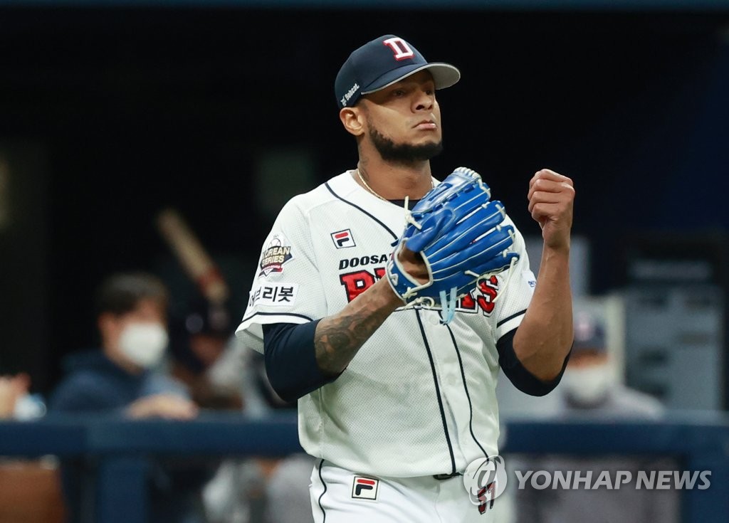 | ▲  In this file photo from Nov. 17, 2021, Ariel Miranda of the Doosan Bears celebrates the end of the top of the fourth inning against the KT Wiz in Game 3 of the Korean Series at Gocheok Sky Dome in Seoul. (Yonhap) |