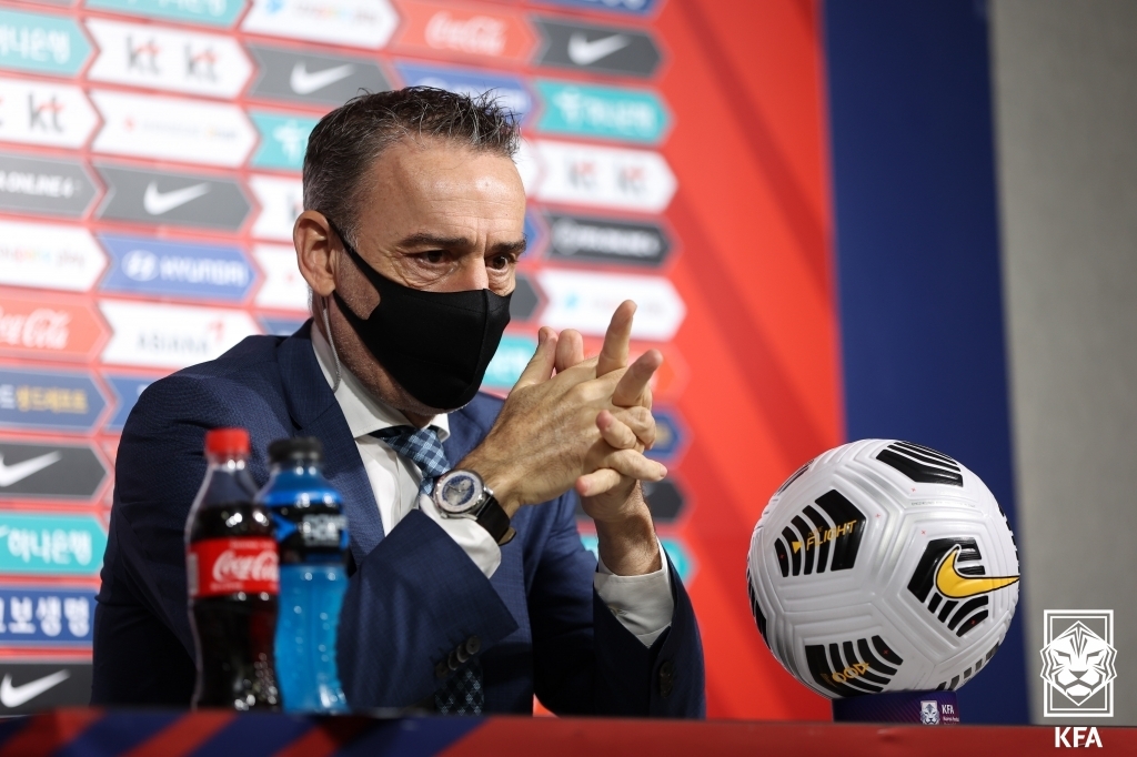 | ▲ Paulo Bento, head coach of the South Korean men's national football team, speaks during a press conference at the Korea Football Association (KFA) House in Seoul on Sept. 27, 2021, in this photo provided by the KFA. (PHOTO NOT FOR SALE) (Yonhap) |