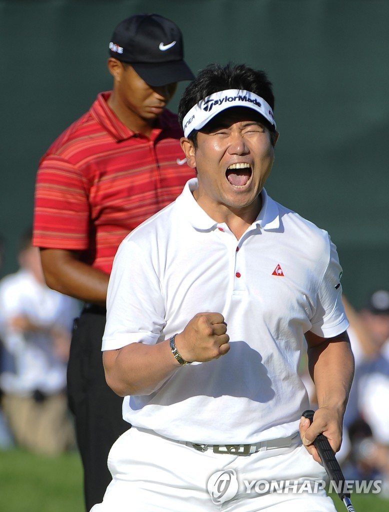 | ▲ 2009년 PGA 챔피언십에서 우즈를 꺾고 환호하는 양용은. [EPA=연합뉴스] |