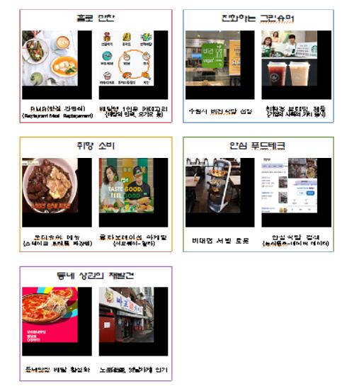 농림축산식품부는 외식문화·소비성향·영업전략 등과 관련된 단어 1천423개를 수집하고 문헌조사와 전문가 조사, 빅데이터 분석을 통해 20개 단어를 도출한 뒤 소비자와 전문가 대상 설문조사를 거쳐 최종 5개 핵심어를 뽑았다고 24일 밝혔다.
