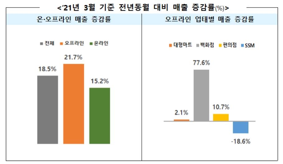 산업통상자원부가 27일 발표한 '3월 주요 유통업체 매출 동향'에 따르면, 오프라인 유통업체 매출은 작년 3월보다 21.7% 늘었다.