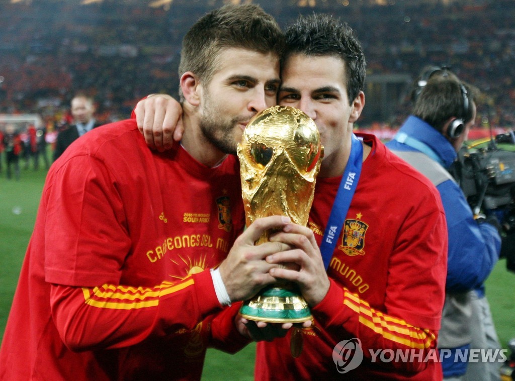 | ▲ 파브레가스와 월드컵 트로피 입 맞추는 피케 [로이터=연합뉴스] |