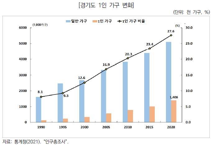 보고서에 따르면 경기도 1인 가구는 1990년 13만 가구에서 2020년 140만 가구로, 전체 가구 유형 중에서 차지하는 비율은 8.1%에서 27.6%로 증가했다.