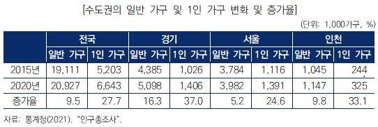 도내 1인 가구 비율은 전국 평균(31.7%)과 수도권 평균(서울 34.9%, 인천 28.3%)보다 낮은 수준이지만, 2015~2020년 1인 가구 증가율은 37.0%로 전국 평균(27.7%)과 수도권 평균(서울 24.6%)보다 높아 가파른 증가세를 보였다.