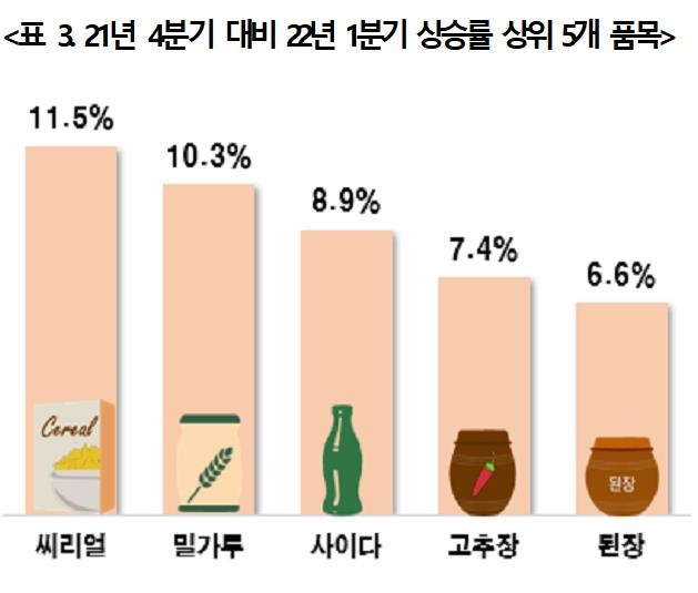 상승률 상위 5개 품목은 시리얼(11.5%), 밀가루(10.3%), 사이다(8.9%), 고추장(7.4%), 된장(6.6%)이었다.