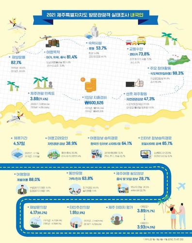 제주관광공사는 6일 2021년 한 해 동안 제주를 방문한 관광객의 제주여행 행태와 소비실태, 제주여행에 대한 평가 등을 조사한 '2021년 제주특별자치도 방문관광객 실태조사' 결과를 발표했다.