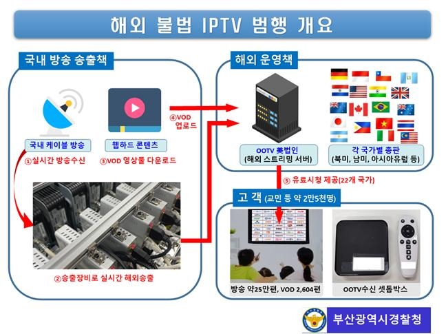 부산경찰청 사이버범죄수사대는 최근 저작권법 위반 혐의로 미국 현지 IPTV(인터넷 프로토콜 TV) 업체 대표와 국내 송출조직 등 7명을 검거했다고 26일 밝혔다.