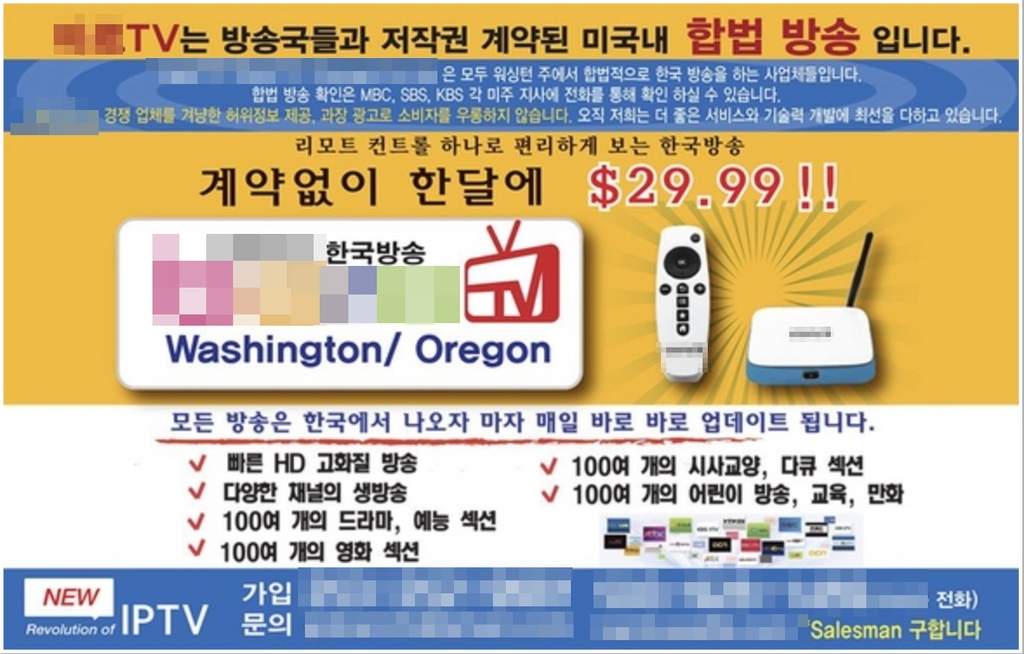 특히 교민신문과 한인 마트 등에서 '합법적인 한국 방송'이라고 광고하면서 가입자를 모집했고, 시청 채널 수 등에 따라 1개월에 19~29달러 정도의 시청료를 받았다.