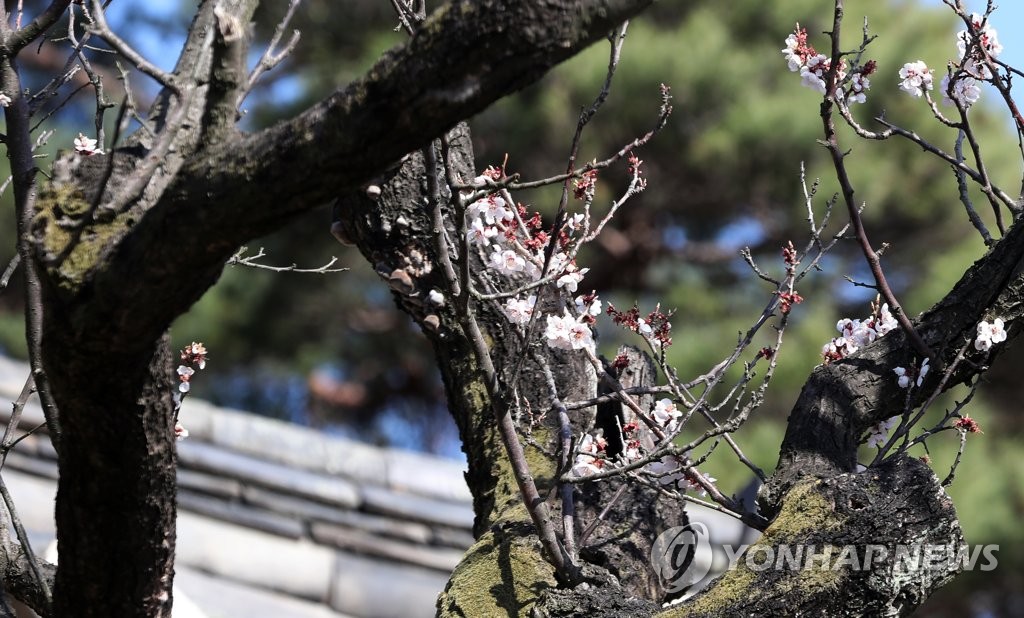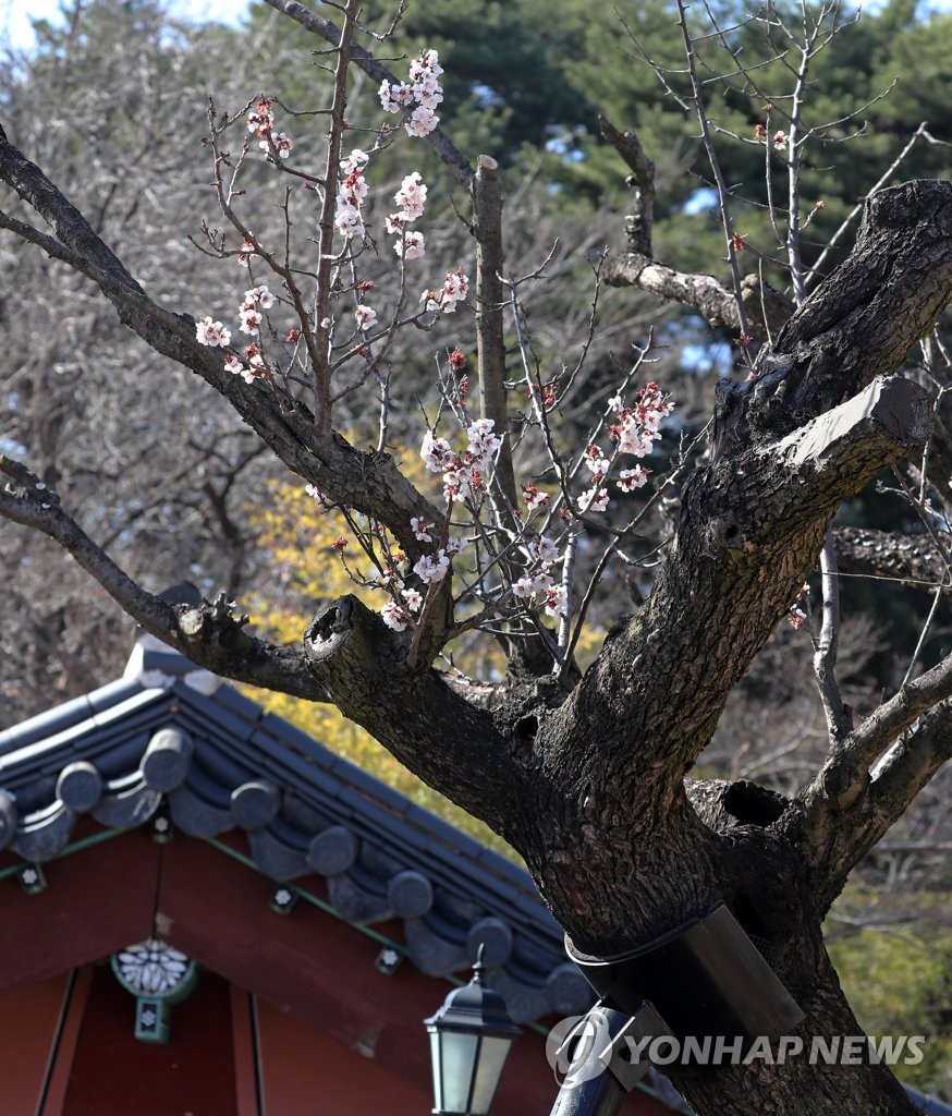 (강릉=연합뉴스) 유형재 기자 = 수령 600년이 넘는 천연기념물 강릉 오죽헌 율곡매가 사실상 고사 판정을 받았음에도 꽃을 활짝 피우며 끈질긴 생명력을 이어가고 있다.