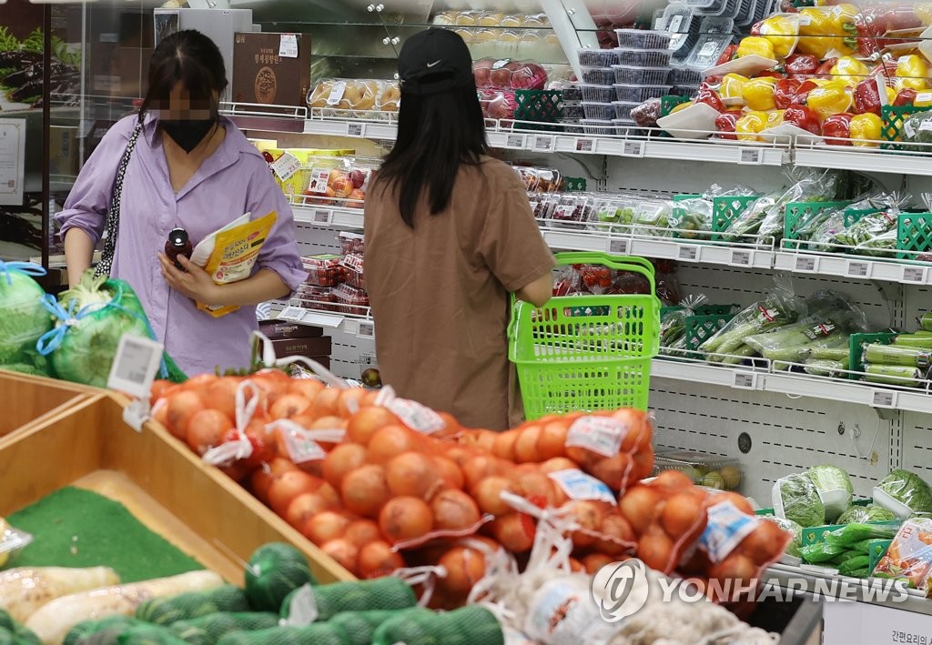 | ▲ In this file photo, shoppers select vegetables at a supermarket in Seoul on June 26, 2022. The average food bill for a four-person household in the first quarter of 2022 jumped 9.7 percent on-year to 1.06 million won (US$823), according to the data compiled by Statistics Korea. (Yonhap) |