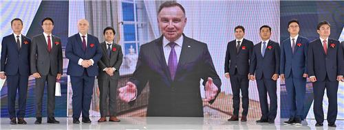 | ▲ SKC CEO Park Won-cheol (2nd from L) and other officials stand on a stage listening to the online congratulatory remarks by Polish President Andrzej Duda on screen during the groundbreaking ceremony for SK Nexilis' copper foil plant in Stalowa Wola on July 7, 2022, in this photo provided by SKC, Nexilis' parent firm. (PHOTO NOT FOR SALE) (Yonhap) |