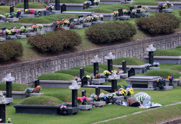 People visit their family members' graves at a cemetery in the city of Chuncheon, Gangwon Province, on Sept. 8, 2024, ahead of Chuseok, the major Korean harvest celebration, which falls on Sept. 17. (Yonhap)