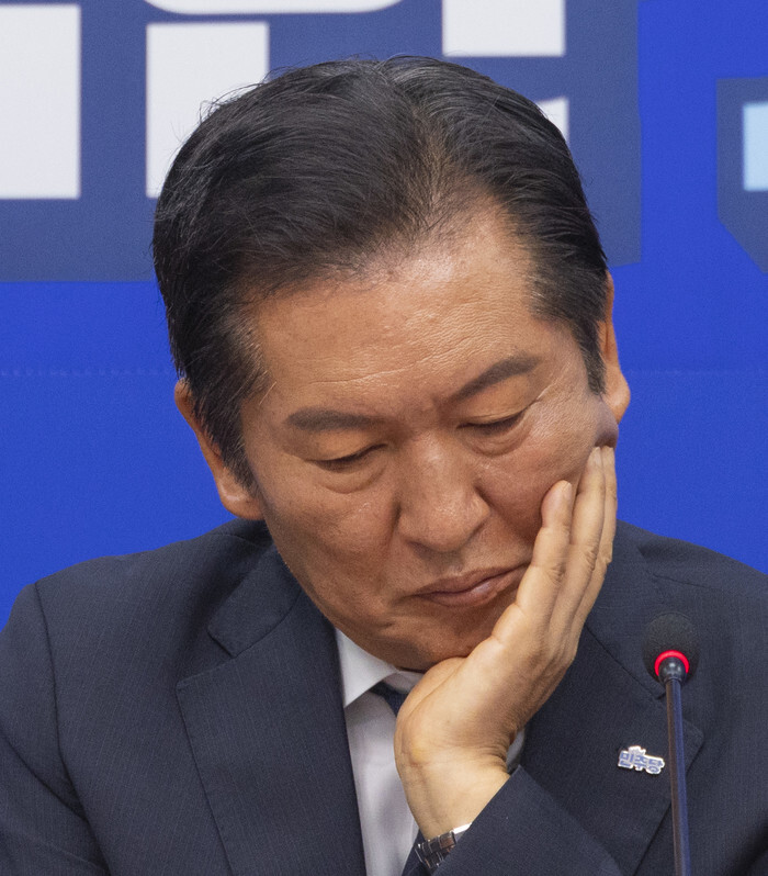 Jung Chung-rae, new leader of the ruling Democratic Party, looks pensive during a meeting of the party's Supreme Council at the National Assembly in Seoul on Aug. 6, 2025, one day after Lee Choon-suak, a lawmaker of the party, quit the party over allegations that he traded stocks under a borrowed name. (Yonhap)