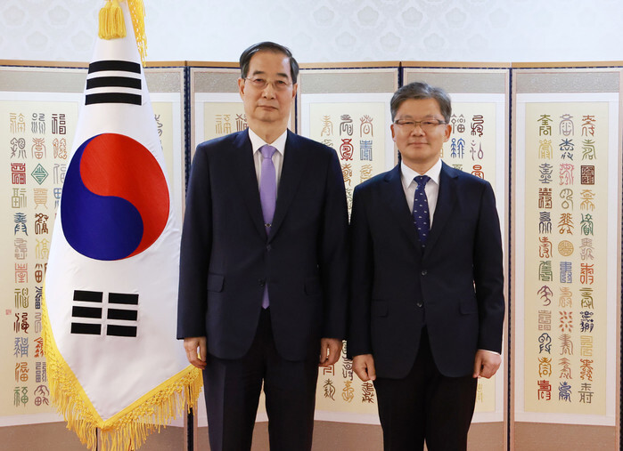 Acting President and Prime Minister Han Duck-soo (L) poses for a photo with new South Korean Ambassador to Azerbaijan Kang Kym-gu after presenting him with a letter of credentials at the government complex in Seoul on April 29, 2025. (Yonhap)